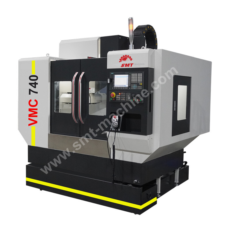 * The VMC 740 is compact design suitable for machining small and medium-sized products. * Precision linear guides and powerful servo drives. * Stable cast frame in rigid bed construction. * Precision ball screws with preloaded nuts in all 3 axes. * Central lubrication for guide ways and ball screws.