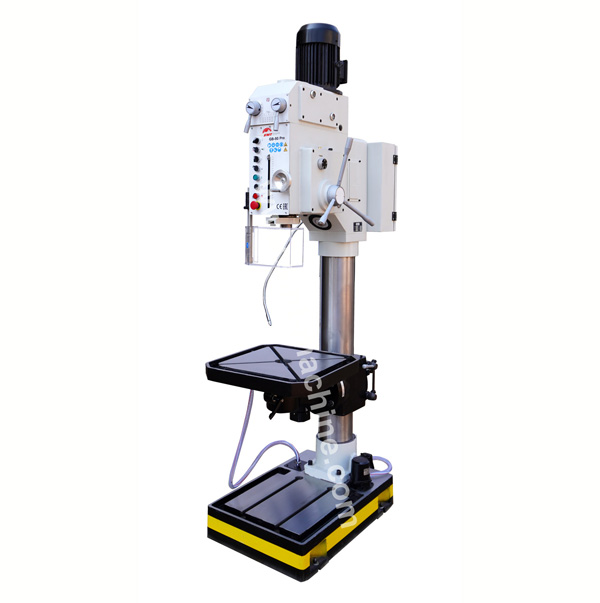 Feature: · Industrial gear drive column drilling machine · Lubrication gear head with quite operation · Adjustable drill depth stop with scale,reading at the front · Working table rotate 360° and swivels ±45° · Rigid constructuion of table and base · Automatic tool release device · Powerful 2-speed motor · Electromagnetic spindle sleeve feed,tapping device · Motorized work table up and down · 24V controlling wiring · Rigid construction of base with coolant tank · Equip with safety spindle guard, LED work lamp, coolant system